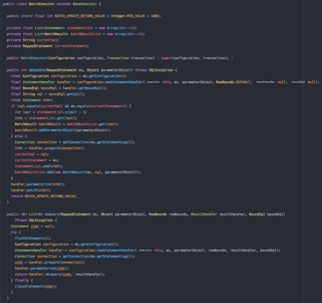- ExecutorType.BATCH: 이 실행자는 모든 update구문을 배치처리하고 중간에 select 가 실행될 경우 필요하다면 경계를 표시한다. 이러한 과정은 행위를 좀더 이해하기 쉽게 하기 위함이다.